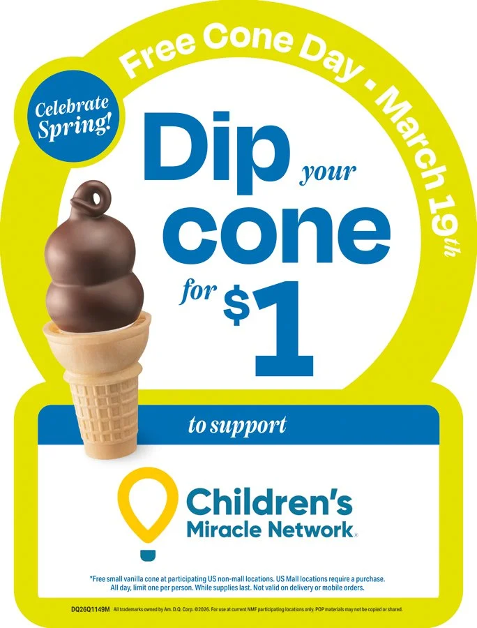 Whether you’re welcoming warmer weather, treating the kids after school, or just looking for an excuse to enjoy a little happiness, Free Cone Day is our way of saying thank you for being part of our DQ family—while giving back to a great cause.
