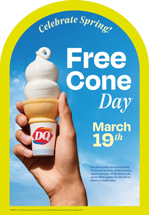 To kick off spring the sweetest way possible, we’re celebrating DQ® Free Cone Day by giving away FREE small vanilla soft-serve cones ALL DAY on Thursday, March 19th!